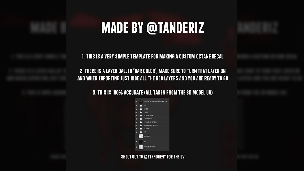 This is a simple and effective template for creating the best custom decals for the Octane. In the future, I'll make a version for the Fennec. If you check all the pictures on the cover, you'll see decals made using ONLY this template. It's the most accurate template available for doing all the work directly in Photoshop.